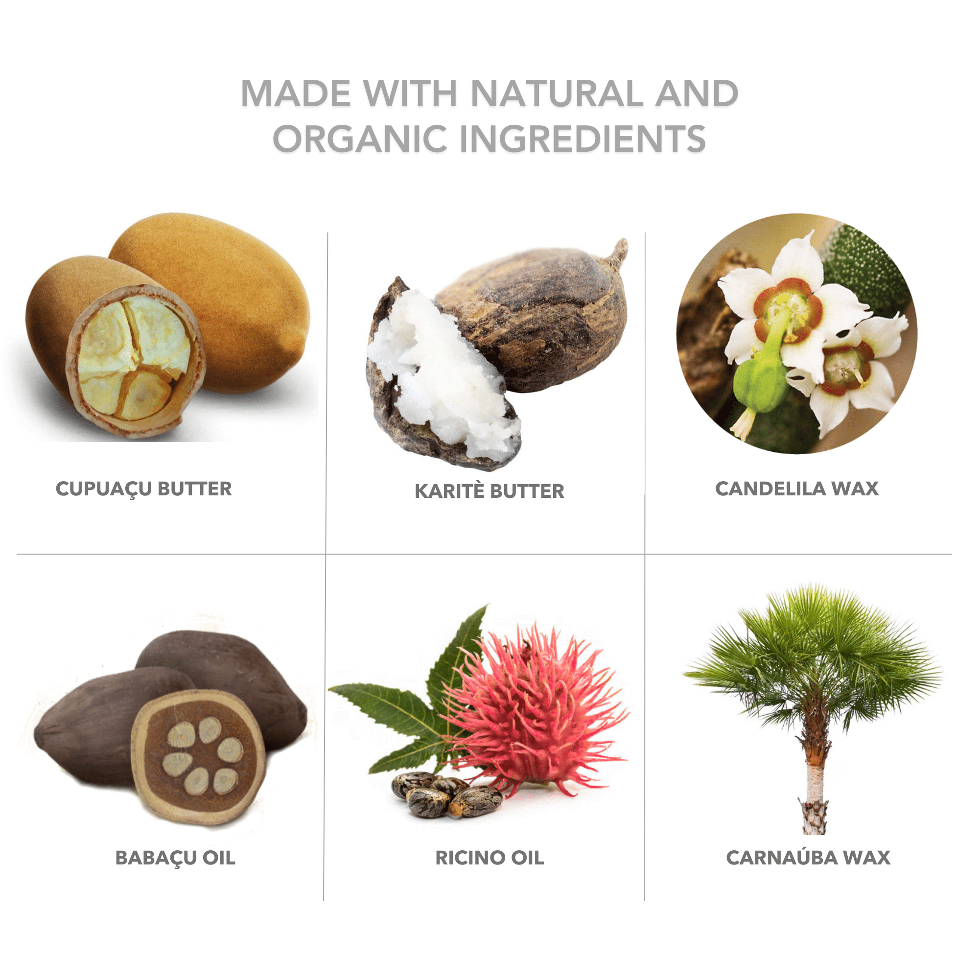 RICINUS COMMUNIS SEED OIL*, HELIANTHUS ANNUUS SEED OIL *, HYDROGENATED OLIVE OIL, COPERNICIA CERIFERA (CARNAUBA) WAX*, OLUS OIL, BUTYROSPERMUM PARKII (SHEA) BUTTER*, EUPHORBIA CERIFERA (CANDELILLA) WAX, HYDROXYSTEARIC/LINOLENIC/OLEIC POLYGLYCERIDES, THEOBROMA GRANDIFLORUM (CUPUACU) SEED BUTTER*, ORBIGNYA OLEIFERA (BABASSU) SEED OIL*, MAURITIA FLEXUOSA FRUIT OIL*, VANILLIN, TOCOPHEROL, GLYCINE SOJA OIL