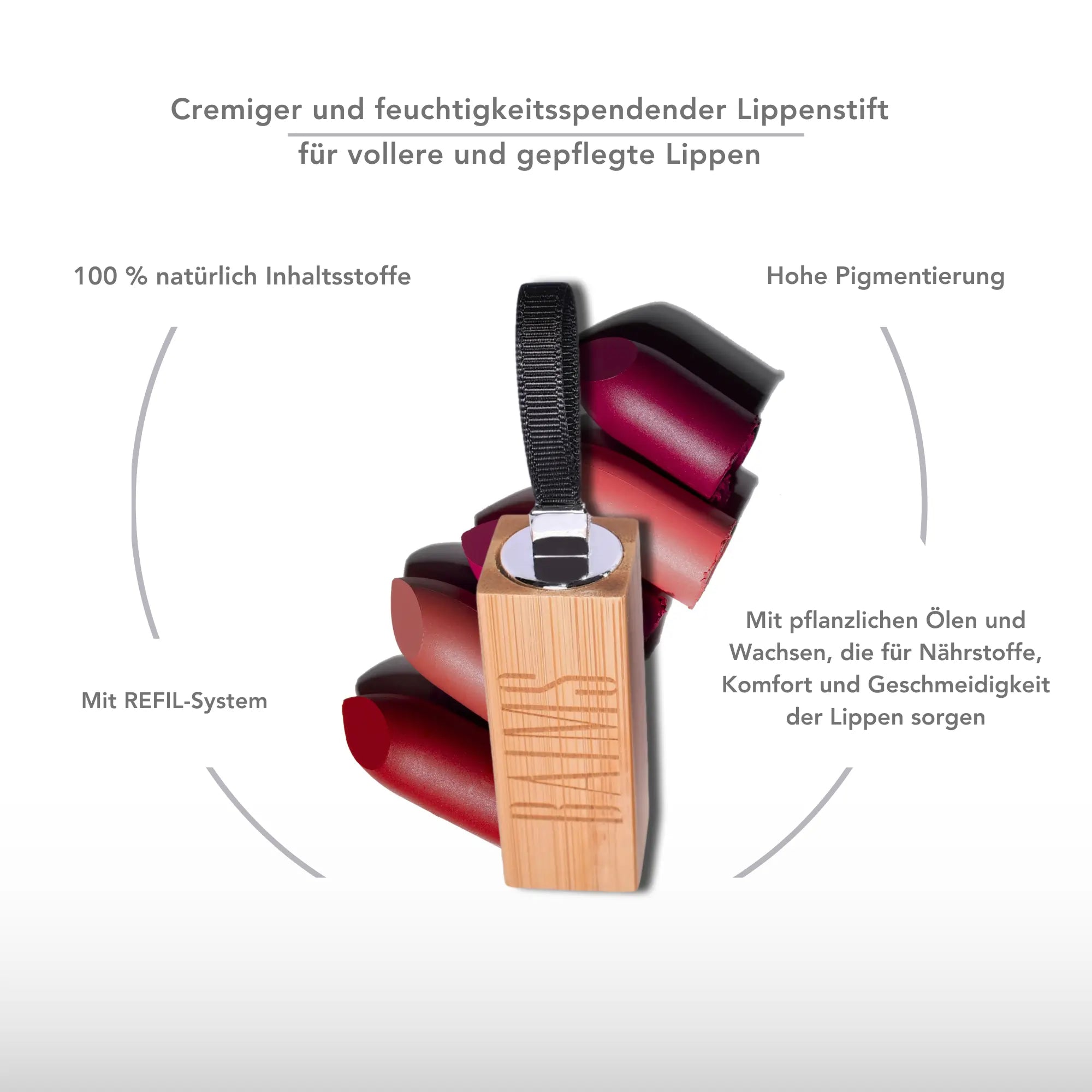 - Außergewöhnliche wiederbefüllbare Bambusverpackung, der Lippenstift wird nachdem er aufgebraucht wurde leicht aus der eleganten Bambusverpackung entfernt und ein neuer Lippenstift ihrer Wahl auf Refill-Basis kann eingesetzt werden.