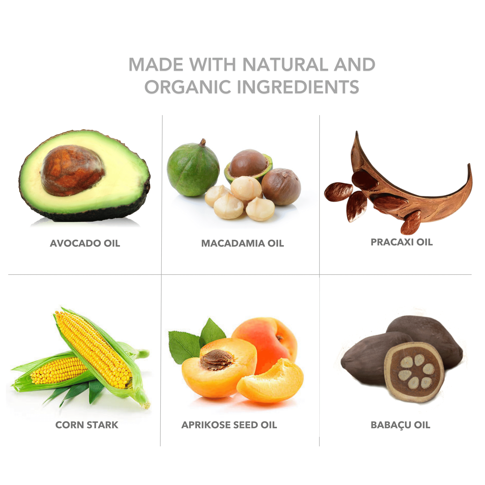 Formulierung basierend auf 100% natürlichen Zutaten, vegan, mit zertifizierten Rohstoffen aus biologischem Anbau.