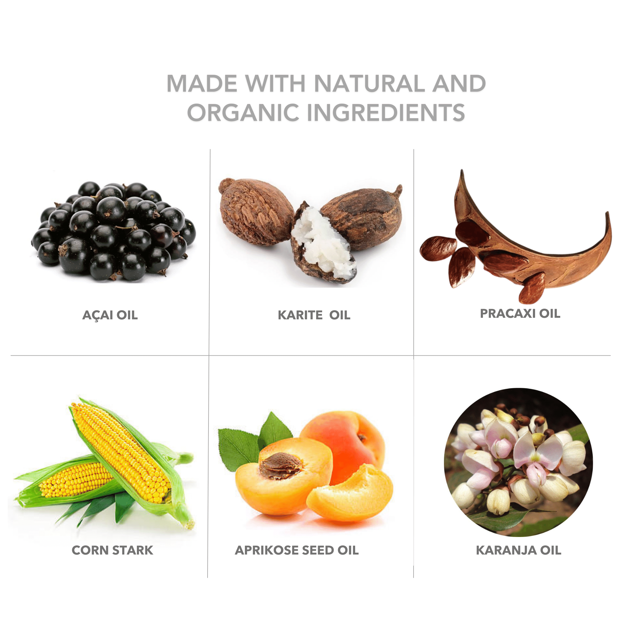 Formulierung basierend auf 100% natürlichen Zutaten, vegan, mit zertifizierten Rohstoffen aus biologischem Anbau.